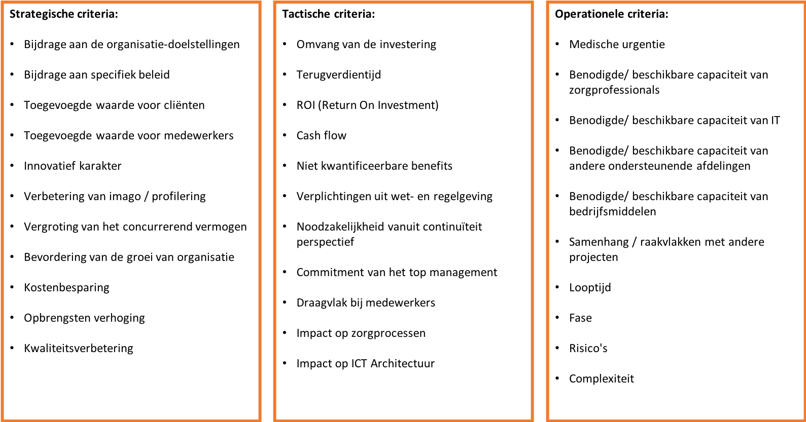 Als een organisatie geen S.M.A.R.T. strategische doelstellingen kent, dan zijn er andere methoden om de wenselijkheid van projecten te bepalen. Een oplossing is bijvoorbeeld om ze onderling allemaal te vergelijken (‘pairwise comparison’). Deze techniek is nogal bewerkelijk, maar hieruit kan een prima eerste indicatie voor prioritering rollen. Een andere methode is het hanteren van een set van criteria waarop projecten worden beoordeeld. Via deze weg kan ook gelijk een indicatie worden verkregen van de maakbaarheid en haalbaarheid van projecten. Zie hieronder voorbeelden van criteria die in de praktijk in de zorgsector worden gehanteerd.