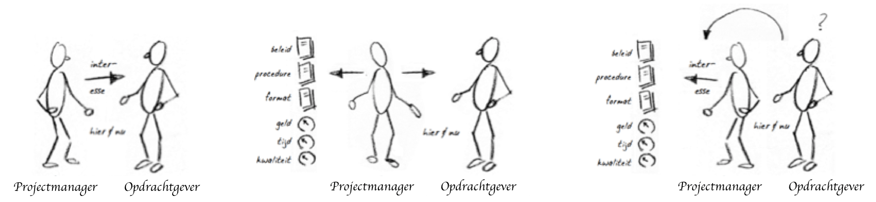 Een fraaie illustratie van een van de gevolgen van te veel bureaucratie schets het onderstaande plaatje uit ‘Verdraaide organisaties’ van Wouter Hart, dat wij vrij vertaald hebben naar de projectorganisatie door ‘professional’ te vervangen door ‘projectmanager’ en ‘unieke klant’ naar ‘opdrachtgever’.